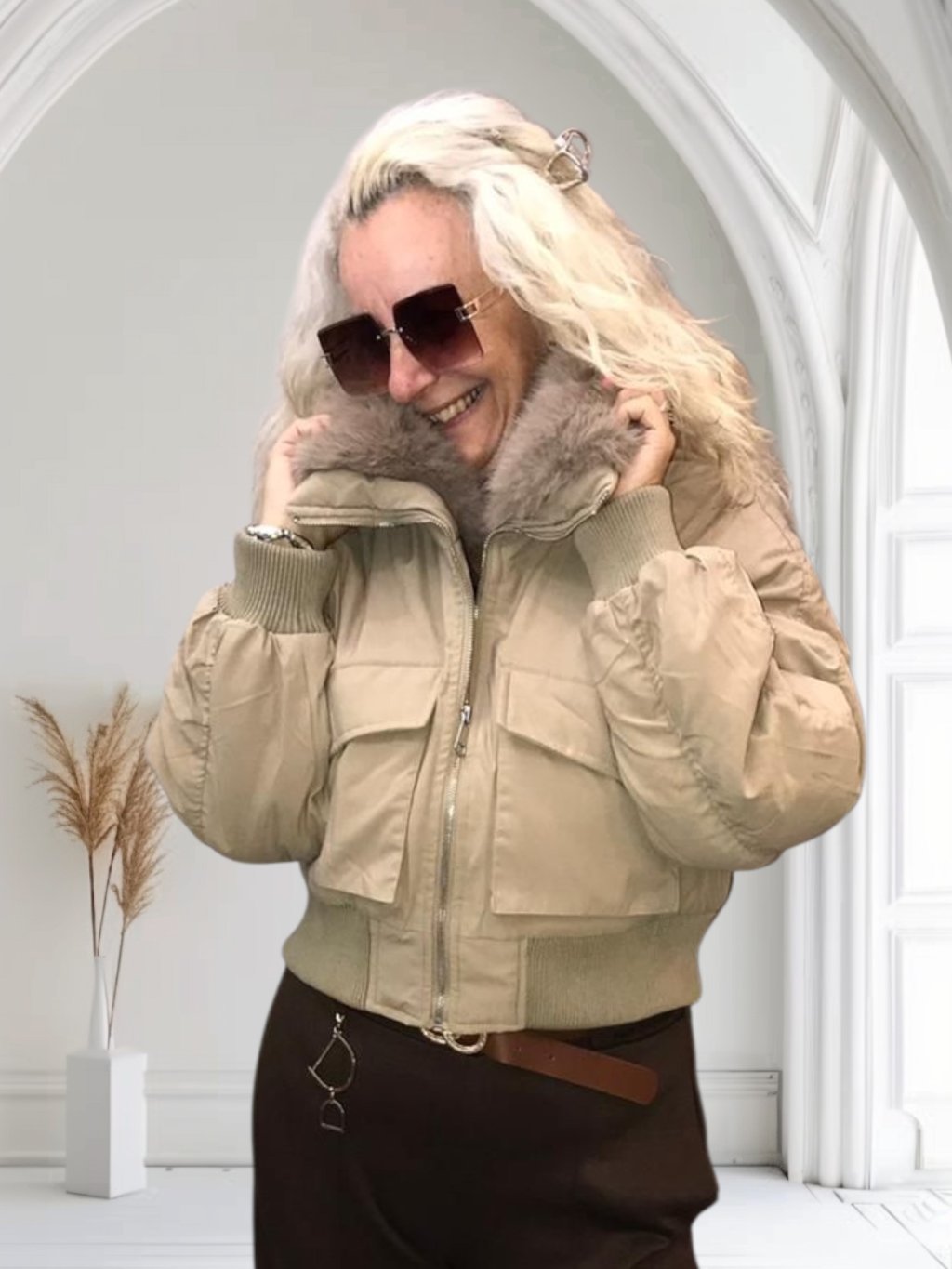 Tato krátká, béžová bunda je ideální volbou! Nabízí trendy střih s velkými kapsami a luxusním límcem z umělé kožešiny. Pružné manžety a spodní lem zajistí, že vám nebude foukat na záda. Je perfektní pro každodenní nošení, ať už do města, nebo na procházku. Oblékněte se stylově a v teple!