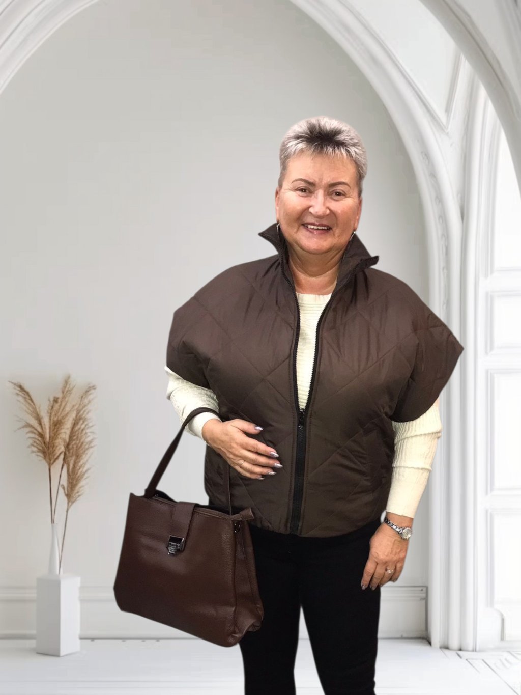 Tato prošívaná vesta v elegantní hnědé barvě je přesně to, co potřebujete! Má jedinečný střih se spadlými rameny, který vám dodá moderní a neotřelý vzhled. Vesta je lehká, ale zároveň příjemně hřejivá, takže se skvěle hodí na podzimní a jarní dny. Je to perfektní doplněk, který oživí jakýkoliv outfit.