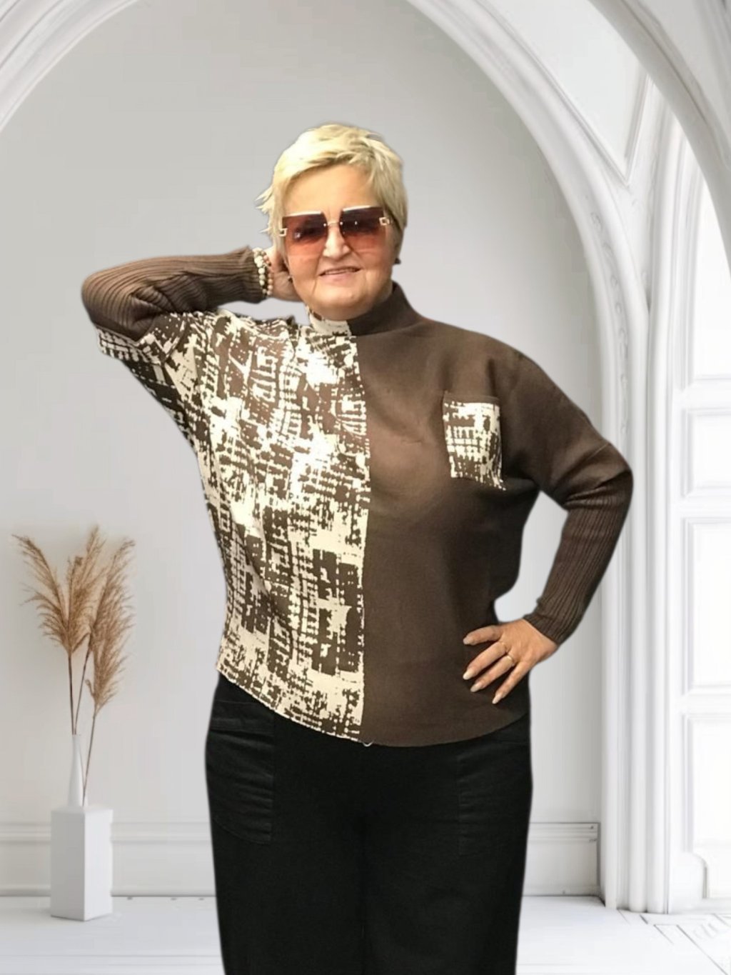 Zapomeňte na nudné jednobarevné svetry. Tento dámský top/svetr je mistrovský kousek, který kombinuje dva materiály a designy do jednoho šik kousku: