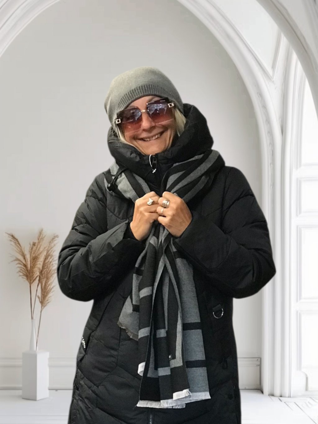 Přidejte kašmírovou šálu a čepici v šedé barvě – vytvoříte nadčasový zimní look.